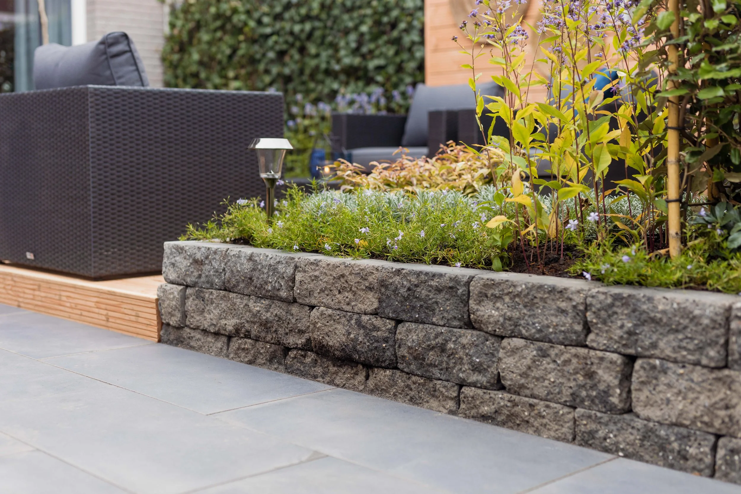 Een veelgekozen toepassing is het maken van een verhoogde border met muurblokken. Hiermee creëer je diepte en structuur in de tuin, terwijl planten beter tot hun recht komen.